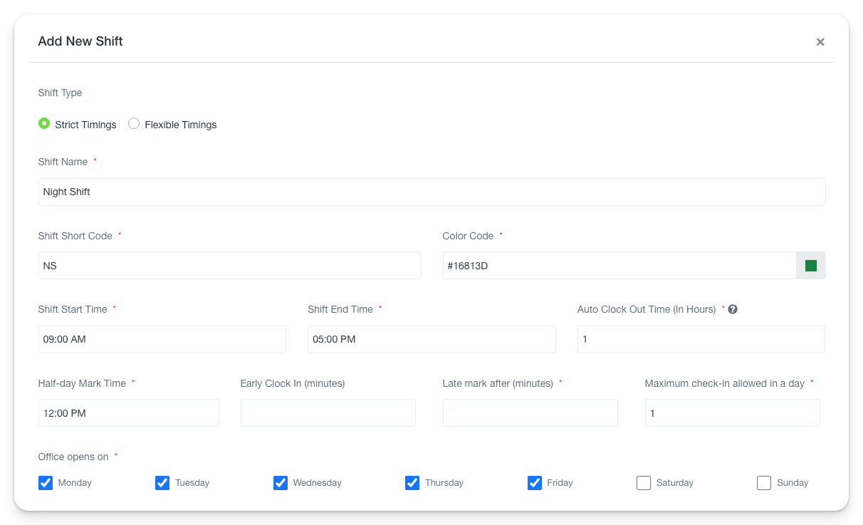 - Shift Type – Choose between Strict Timings (fixed hours) or Flexible Timings (adjustable work hours).
