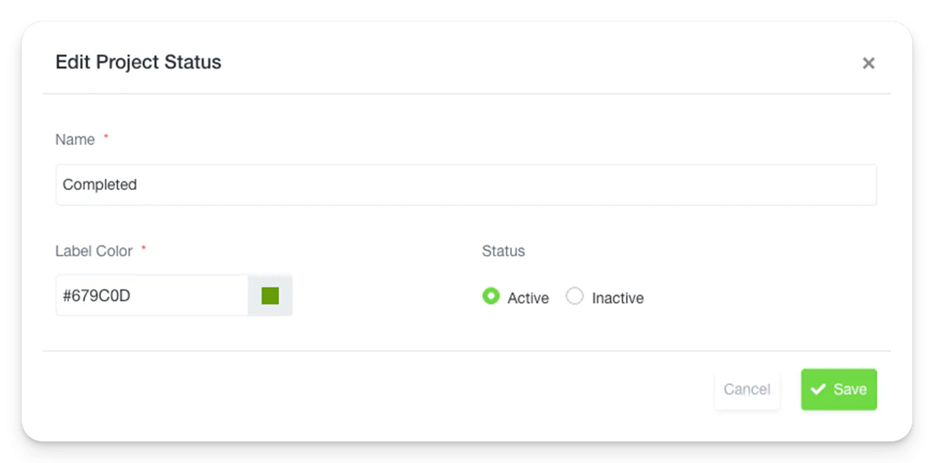 - Each status has a Name, Label Color, and can be marked as Active or Inactive.